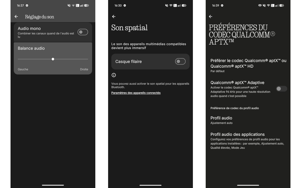 Le Phone (4a) Pro prend en charge le protocole Bluetooth 5.4. Il prend en charge les formats SBC, AAC et LE Audio. Il prend également en charge l’aptX HD de Qualcomm, mais pas les autres codecs HD, comme le DTS-X ou le Dolby Atmos. Le Phone (4a) Pro peut prendre en charge le son spatial, mais uniquement avec un casque filaire. Nothing OS ne dispose pas d’un égaliseur, qu’il soit complet ou offrant simplement des profils audio selon les contenus. C’est dommage.