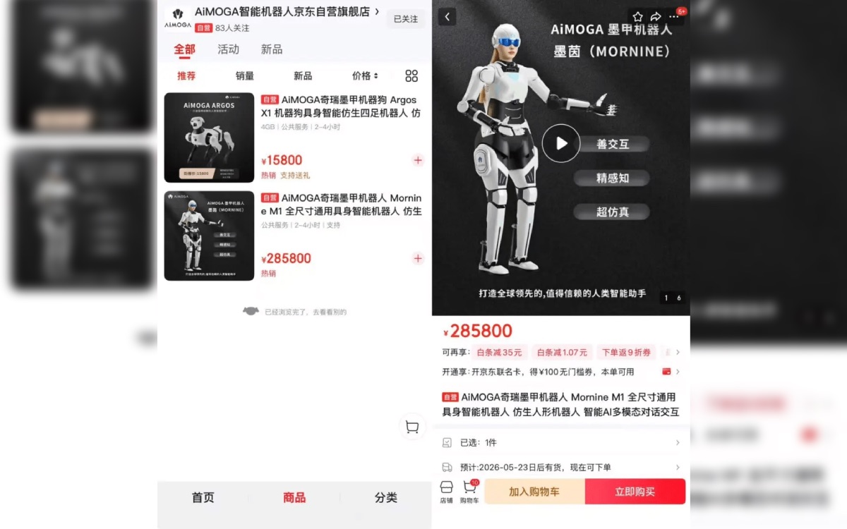 Chery, qui est un grand constructeur automobile chinois, a officiellement lancé la vente en ligne de son robot humanoïde via sa filiale AiMoga. Depuis le 13 avril 2026, le Mornine M1 est disponible sur une boutique officielle JD.com. Les premières livraisons sont attendues après le 23 mai 2026. Ce dernier avait tenu une conférence de distribution en Chine l'année dernière et noué des accords avec plusieurs revendeurs pour préparer ce lancement.