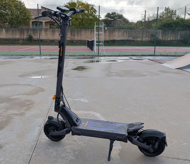 Le confort ne nous a en revanche pas semblé exceptionnel, malgré la présence d’une double suspension. Celle-ci est tarée trop dur et, même si nous pesons notre poids, elle ne réagit que sur les gros chocs. En y regardant de plus près, il y a une possibilité d’ajuster la précontrainte des deux amortisseurs pour les assouplir un peu, mais il faut pour cela une clé spécifique qui n'est pas fournie. Les pneus plus cramponnés que ceux des trottinettes purement urbaines peuvent générer sur certaines chaussées quelques vibrations. À très haute vitesse, la tenue de route devient plus aléatoire, avec notamment un phénomène de guidonnage qui peut apparaître. Évidemment, les pilotes les plus aguerris trouveront là de quoi s’amuser, et ce, sans se ruiner, car rappelons que cette trottinette est largement sous la barre des 1000 €.