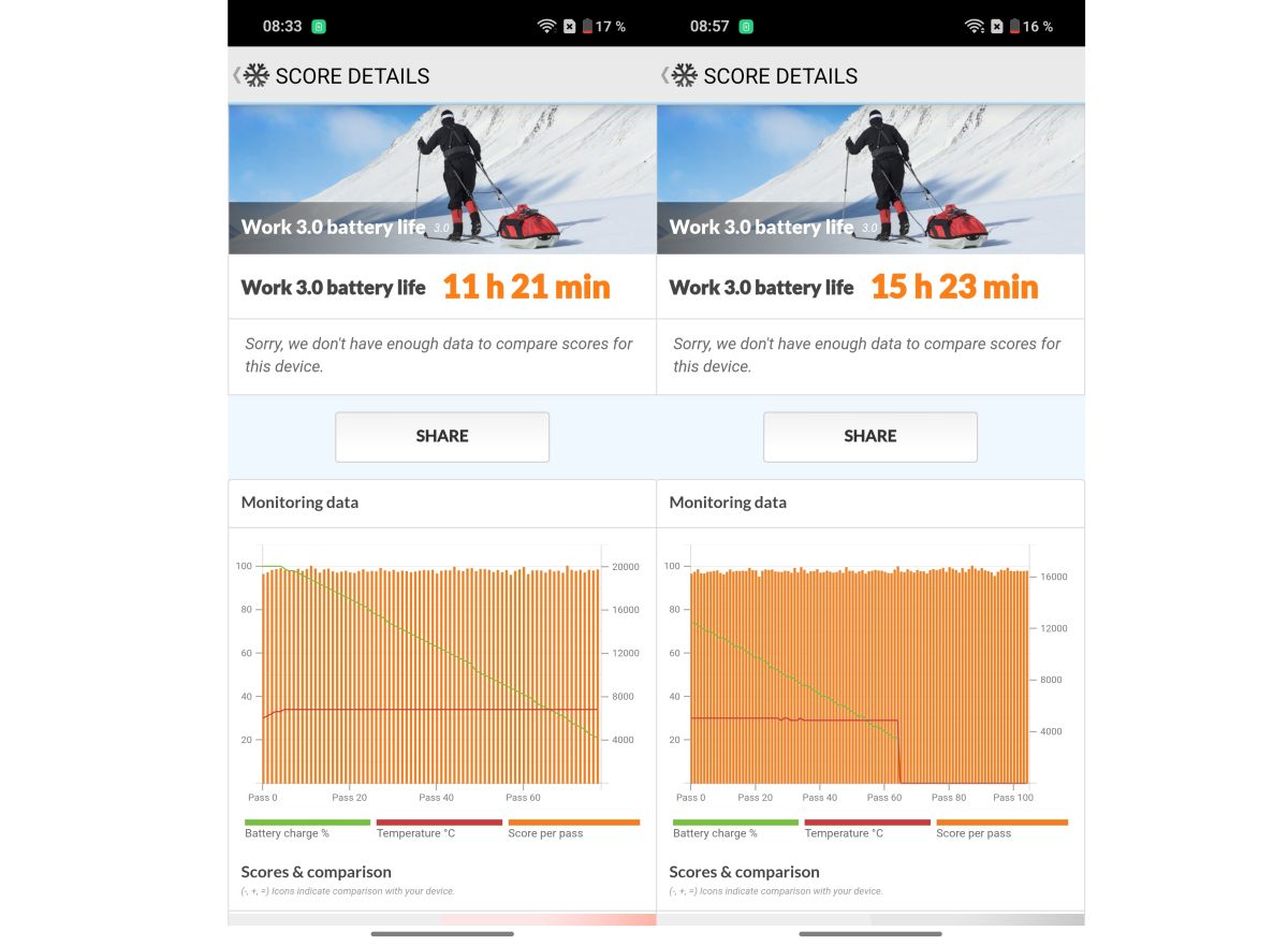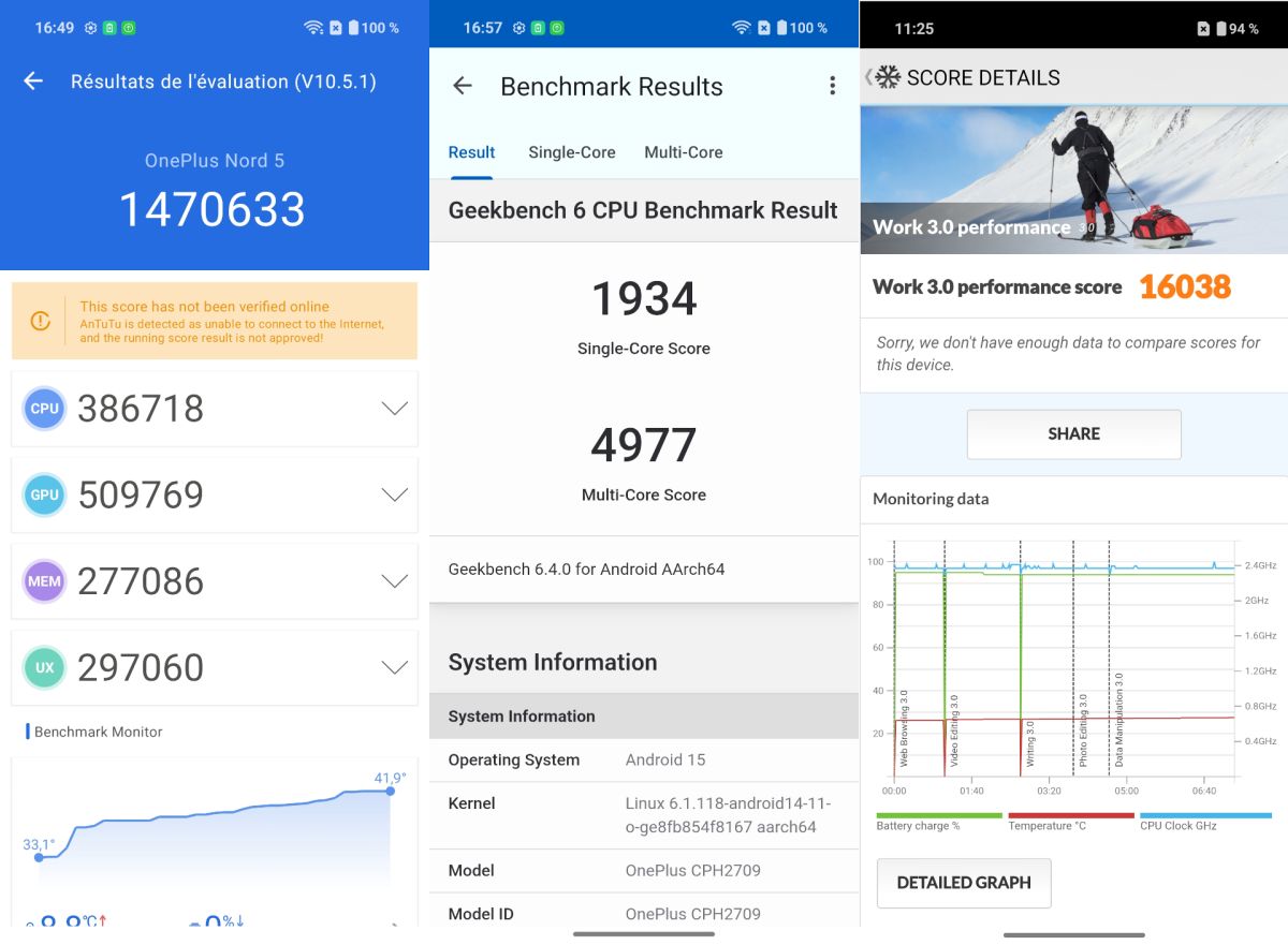 On note que – dans les deux cas – l'autonomie du OnePlus Nord 5 est inférieure d'environ 2 heures à celle mesurée sur son petit frère, le OnePlus Nord CE5.