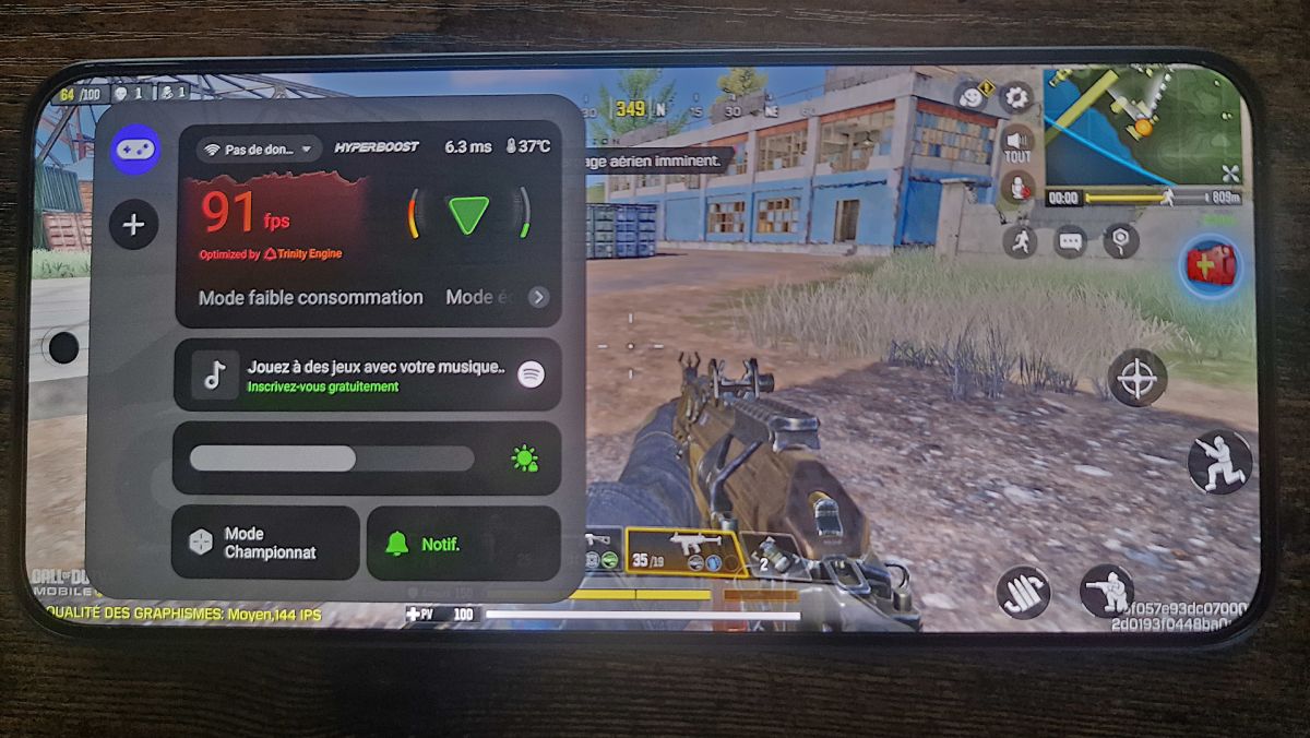 De plus, lors de notre test, la boîte à outils de jeux de OnePlus, que l'on peut faire apparaître à tout moment dans une petite fenêtre flottante, indiquait que cette fréquence extrême n'était pas atteinte dans COD. En effet, son compteur plafonnait aux environs de 90 images par seconde, alors que – juste en dessous – le jeu disait bien qu'on se trouvait en mode 144 Hz, avec une qualité graphique moyenne.