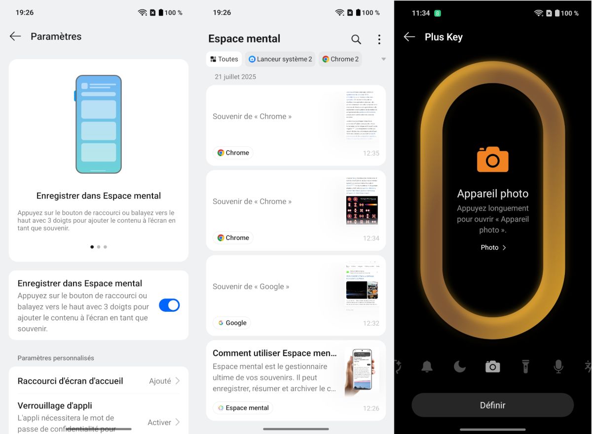 Cette Plus Key a deux fonctions. La première est de faire une capture d'écran et de l'envoyer vers l'Espace mental (voir plus loin). La seconde dépend de qui a été configuré dans les paramètres. Ainsi, elle peut être utilisée pour réaliser diverses opérations, en effectuant une pression longue :